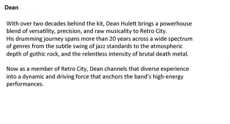 Retro City is a vibrant 5-piece cover band dedicated to delivering an unforgettable musical experience.